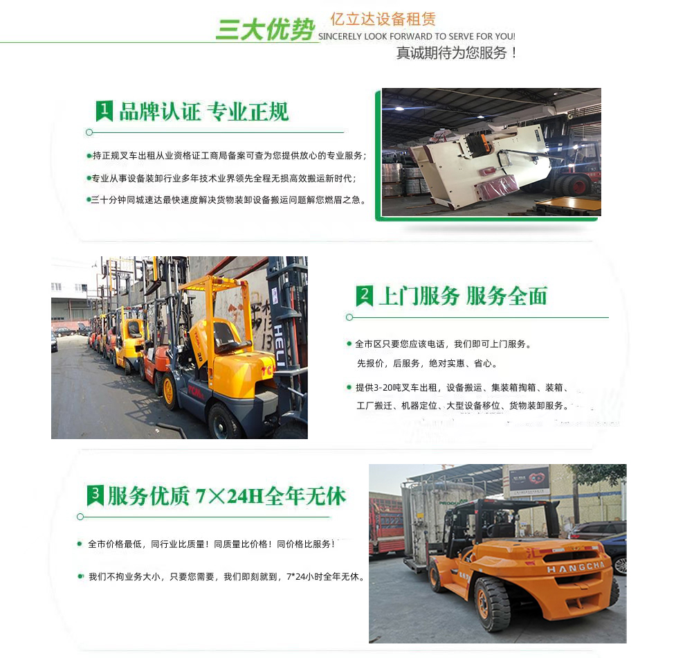 亿立达设备租赁有限公司是工商局准许的对外经济贸易大学专业叉车出租公司,公司本着诚信、服务、效率、创新的经营理念,用精湛的技术,真诚的服务,为众多客户提供优质的服务,同时获得信赖与支持。专业提供对外经济贸易大学3-20吨叉车出租、叉车租赁、设备搬运、集装箱掏箱装箱、机器移位定位、货物装卸、工厂搬迁、安全可靠,收费透明,价格便宜,随叫随到,24小时上门服务!本公司叉车吊车师傅对各种设备搬运装卸都有深刻探讨和研究。很多的疑难设备搬运,通过我公司的叉车师傅都能迎刃而解。对各种进口设备、国产机器、大型设备搬迁、高难度搬迁、各种精密仪器、医疗设备、科研设备等都能搬运; 提供全市 24 小时上门装卸搬运服务。同时提供厂房搬迁服务。 ...